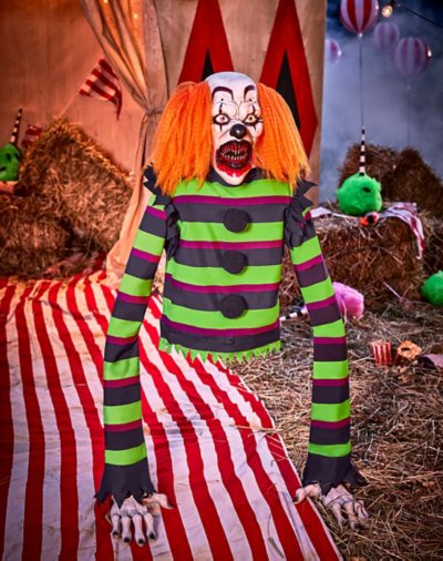George was a good clown. He made the kids laugh, the parents smile and kept the circus happy. Then a strange thing happened on Halloween. George was performing for tips in the street while the circus was on winter break when an out-of-control cable car careened around the corner and sliced him in half. Amazingly George's body survived the accident, but his mind became tormented. Instead of jokes and gags, he now stares down passersby laughing maniacally but they better not stay too long because poor George will ensure they don't get very far. After his terrible accident Poor George gained a few more tricks up his sleeve. Put him on display and watch as he terrifies guests with his maniacal laugh and flipping torso that rotates at the shoulders. With Poor George on display youll have the perfect animatronic to enhance your twisted circus Halloween scene. Includes: Animatronic Instruction.