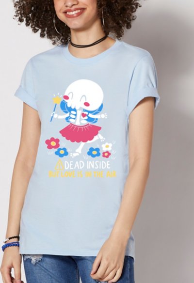 Who knew death could be so cheerful? This Dead Inside graphic tee with artwork by TaylorRoss1 will make a bold and exciting addition to your casual wardrobe. Exclusively at Spencer's Officially licensed Crewneck Short sleeves Material: Cotton Care: Machine wash; tumble dry low Imported This shirt is Unisex Sizing only For a fitted look, order one size smaller than your normal size Note: This item is print to order and may have a 1-2 day extra processing time.
