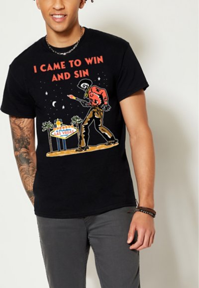 Everybody knows Vegas is for winnin' and sinnin'. Saddle up in the afterlife with this officially licensedSkeleton Cowboy Win & Sin T Shirt. Officially licensed Crewneck Short sleeves Material: Cotton Care: Machine wash; tumble dry low Imported This shirt is Unisex Sizing only For a fitted look, order one size smaller than your normal size Note: This item is print to order and may have a 1 to 2 day extra processing time.
