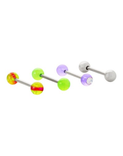 Includes: 4 Barbells Piercing type: Tongue Material: 316L surgical steel Gauge: Gauge / 1.6mm Length: 16mm Stone type: Glass stone Stone color: Clear External thread closure Jewelry care: Clean with antibacterial soap and warm water Piercing care: Clean with H2Ocean Aftercare Spray (sold separately) or saline solution Imported Note: Do not use any harsh, alcohol-based chemicals as this may cause tarnishing Note: Do not over-thread or apply excess pressure when adding/removing beads as breakage could occur Wear in healed piercings only. If irritation occurs, remove immediately Surgical steel may contain t.