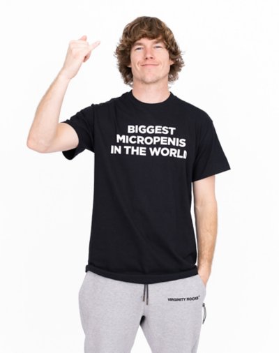 Let the world know what you have to offer in this hilariousBiggest Micropenis In The World T Shirt. This black tee features white block lettering that says "Biggest Micropenis In The World." Officially licensed Exclusively at Spencer's Crewneck Short sleeves Tagless Length: About 29" from shoulder to hem Material: Cotton Care: Machine wash; tumble dry low Imported This shirt is Unisex Sizing only For a fitted look, order one size smaller than your normal size.