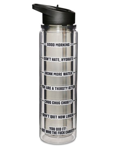 You'll always have the motivation you need to drink more water with this Hydration Parody Water Bottle. With inspiring and hilarious messages in increments on the side this water bottle is the perfect option for anyone who needs to be told to keep drinking more water. Exclusively at Spencer's Dimensions: 10" H x 3" W x 3" D Capacity: oz. Material: Plastic Care: Gently hand wash only Imported.