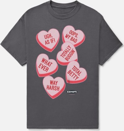 As if you'd ever get caught looking anything but adorable! Rock this Clueless candy heart t shirt and let everyone know that it's one of your favorite movies. Officially licensed Crewneck Short sleeves Material: Cotton Care: Machine wash; tumble dry low Imported This shirt is Unisex Sizing only For a fitted look, order one size smaller than your normal size.