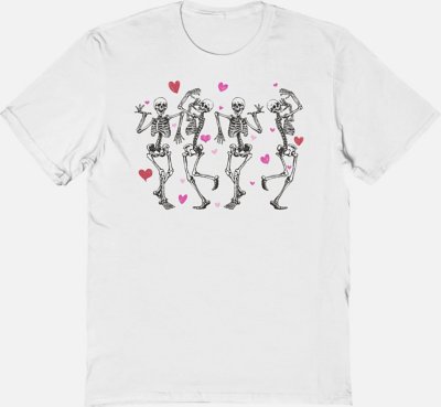 Feel the love all the way in your bones this Valentine's Day when you wear this Dancing Skeletons T Shirt. This stylish tee is the perfect choice for any Valentine's Day gathering and sure to have you looking good and showing the love everywhere you go. Crewneck Short sleeves Material: Cotton Care: Machine wash; tumble dry low Imported This shirt is Unisex Sizing only For a fitted look, order one size smaller than your normal size Note: This item is print to order and may have a 1-2 day extra processing time.