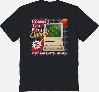 Commit tax fraud online! It's all the rage! Just like this hilariousCommit Tax Fraud T Shirt from The Westwood. Officially licensed Crewneck Short sleeves Material: Cotton Care: Machine wash; tumble dry low Imported This shirt is Unisex Sizing only For a fitted look, order one size smaller than your normal size Note: This item is print to order and may have a 1 to 2 day extra processing time.