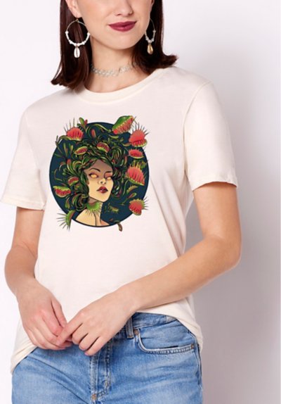 Don't let your mind trap you. Show off some chill vibes with this Venus Flytrap Girl T Shirt. Crewneck Short sleeves Material: Cotton Care: Machine wash; tumble dry low Imported This shirt is Unisex Sizing only For a fitted look, order one size smaller than your normal size Note: This item is print to order and may have a 1-2 day extra processing time.
