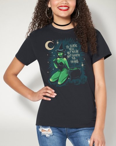 Choose your battles! This dark and dazzling graphic tee designed by Ashley Baxter features a sultry witch next to her cauldron. She says, "I'd curse you, but you're not worth the herbs." Officially licensed Exclusively at Spencer's Crewneck Short sleeves Material: Cotton Care: Machine wash; tumble dry low Imported This shirt is Unisex Sizing only For a fitted look, order one size smaller than your normal size Note: This item is print to order and may have a 1-2 day extra processing time.