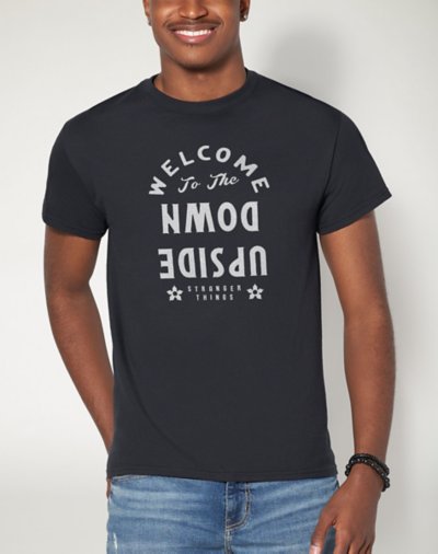 Welcome to the Upside Down! Things are a little strange here. This black graphic tee is perfect for fighting Demogorgons or watching Stranger Things! Officially licensed Crewneck Short sleeves Material: Cotton Care: Machine wash; tumble dry low Imported This shirt is Unisex Sizing only For a fitted look, order one size smaller than your normal size.