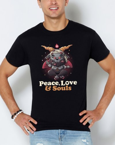 Show off your dark side with this graphic tee! This peace, love and souls t shirt is sure to get you plenty of compliments whenever you wear it. Officially licensed Crewneck Short sleeves Tagless Length: About 29" from shoulder to hem Material: Cotton Care: Machine wash; tumble dry low Imported This shirt is Unisex Sizing only For a fitted look, order one size smaller than your normal size Note: This item is print to order and may have a 1 to 2 day extra processing time.