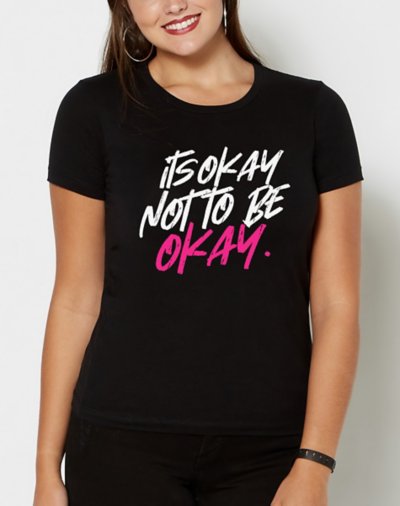 It's okay not to be okay. This bold t shirt by El Chachos features a message that everyone needs to hear. With bright white and electric pink print on a black background, this t shirt speaks loud and clear. Crewneck Short sleeves Material: Cotton Care: Machine wash; tumble dry low Imported Regular fit Note: This tee is in Unisex Sizing only For a fitted look, order one size smaller than your normal size Note: This item is print to order and may have a 1-2 day extra processing time.