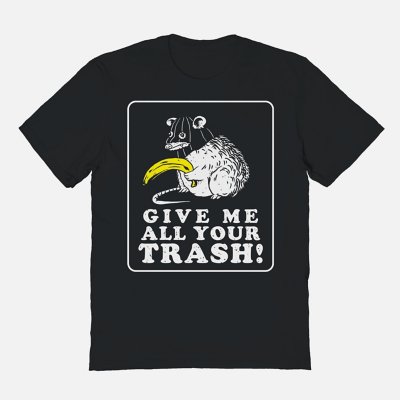 This possum doesn't play about his trash! Wear this adorable Give Me Your Trash T Shirt and you'll always be showing your hilarious personality. Featuring a bandit possum on the front, this tee will make a great addition to any t shirt collection. Crewneck Short sleeves Material: Cotton Care: Machine wash; tumble dry low Imported This shirt is Unisex Sizing only For a fitted look, order one size smaller than your normal size Note: This item is print to order and may have a 1-2 day extra processing time.