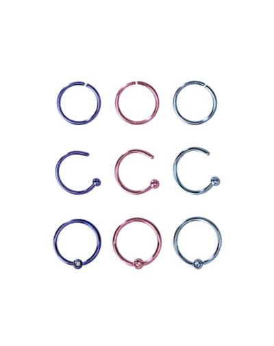 Exclusively at Spencer's Includes: 3 Captive Rings 3 Hoop Nose Rings 3 Half Hoop Nose Rings Piercing Type: Nostril Material: 316L surgical steel Ion-plated Gauge: gauge/0.8mm Length: 6mm Ball size: 2mm Stone type: Cubic zirconia Jewelry Care: Clean with antibacterial soap and warm water Piercing Care: Clean withH2Ocean Aftercare Spray(sold separately) or saline solution Imported Note: Do not use any harsh, alcohol-based chemicals as this may cause tarnishing Surgical steel may contain trace.