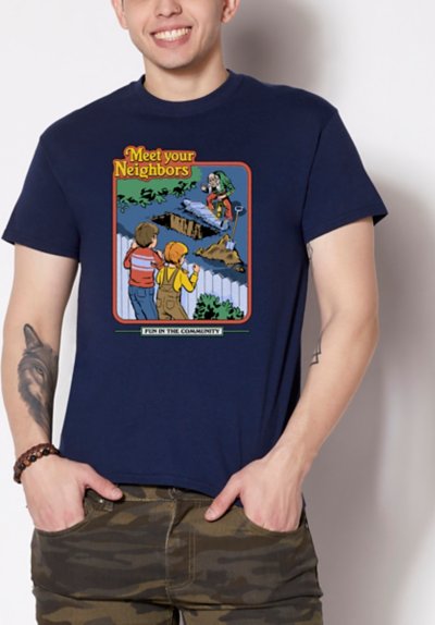 Add a fresh new look to your casual outfit by adding this Meet Your Neighbors T Shirt- Steven Rhodesto your casual wardrobe. This awesome tee features the work of Steven Rhodesand is sure to have you looking and feeling your best. Officially licensed Exclusively at Spencers Crewneck Short sleeves Length: About 29 from shoulder to hem Material: Cotton Care: Machine wash; tumble dry low Imported Regular fit Note: This tee is in Unisex Sizing only For a fitted look, order one size smaller than your normal size This item is print to order and may have a 1-2 day extra processing time.