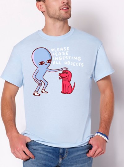 Please, slobbering creature, cease ingesting all objects. This funny graphic tee by Nathan W. Pyle features a relatable scenario between an alien and its dog. Officially licensed Exclusively at Spencer's Crewneck Short sleeves Material: Cotton Care: Machine wash; tumble dry low Imported This shirt is Unisex Sizing only For a fitted look, order one size smaller than your normal size Note: This item is print to order and may have a 1 to 2 day extra processing time.