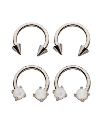 Includes: 2 Pairs of horseshoe rings Piercing Type: Multiple Barbell Material: 316L Surgical steel Accent material: 316L Surgical steel Gauge: Gauge/1.2mm Length: 5/16"/8mm Stone Type: Cubic zirconia Externally threaded closure Jewelry Care: Clean with antibacterial soap and warm water Piercing Care: Clean withH2Ocean Aftercare Spray(sold separately) or saline solution Imported Note: Do not use any harsh, alcohol-based chemicals as this may cause tarnishing Do not over-thread or apply excess pressure when adding/removing beads as breakage could occur Wear in healed piercings only. If irritation occurs, remove imme.