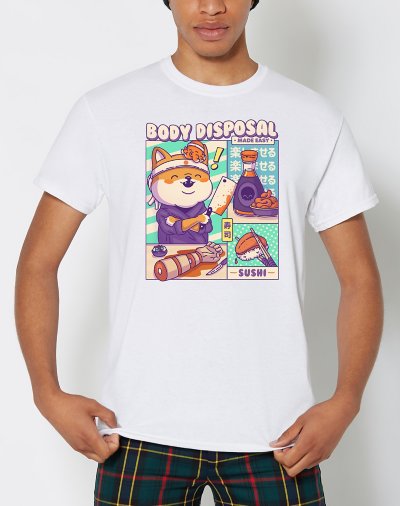 What's the best way to dispose of a body? Sushi, of course! This funny (and slightly dark) graphic tee by Kawaii Krypt features a smiling dog who's obviously up to no good. Crewneck Short sleeves Material: Cotton Care: Machine wash; tumble dry low Imported This shirt is Unisex Sizing only For a fitted look, order one size smaller than your normal size Note: This item is print to order and may have a 1-2 day extra processing time.