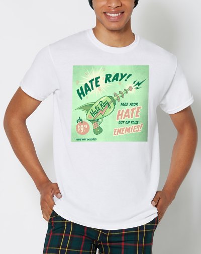 Take your hate out on your enemies! Blast 'em away with this vintage ad-inspired Hate Ray T Shirt designed by Tragic Girls. Crewneck Short sleeves Material: Cotton Care: Machine wash; tumble dry low Imported This shirt is Unisex Sizing only For a fitted look, order one size smaller than your normal size Note: This item is print to order and may have a 1-2 day extra processing time.
