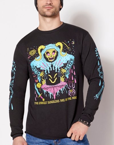 Get compliments galore when you wear this The Darkest Dungeons Are In The Mind Long Sleeve T Shirt. With this artistic design on the front and sleeves, you're sture to grab everyone's attention. Exclusively at Spencer's Officially licensed Crewneck Long sleeves Tagless Length: 29" from shoulder to hem Material: Cotton Care: Machine wash; tumble dry low Imported Regular fit Note: This tee is in Unisex Sizing only For a fitted look, order one size smaller than your normal size.