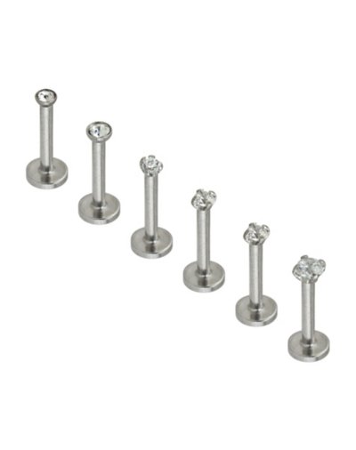 Includes: 6 Labret lip rings Piercing Type: Lip Barbell Material: 316L Surgical steel Accent Material: Metal alloy Gauge: Gauge/1.3mm Length: 5/16"/8mm Stone Type: Cubic zirconia Threaded closure Jewelry Care: Clean with antibacterial soap and warm water Piercing Care: Clean with H2Ocean Aftercare Spray (sold separately) or saline solution Imported Note: Do not use rubbing alcohol to clean jewelry. Normal alcohol consumption and/or mouthwash may accelerate wear and tear Do not over-thread ora apply excess pressure when adding/removing beads as breakage could occur Surgical steel may contain trace amounts of nickel.