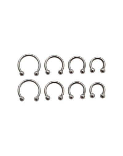 Exclusively at Spencer's Includes: 4 Pair of horseshoe rings Piercing Type: Multiple Barbell Material: 316L Surgical steel Accent Material: Metal alloy Plating: Ion plated Gauge: Gauge/2.6mm Length: 3/8" Ball Size: 4mm Threaded closure Jewelry Care: Clean with antibacterial soap and warm water Piercing Care: Clean with H2Ocean Aftercare Spray (sold separately) or saline solution Imported Note: Do not use any harsh, alcohol-based chemicals as this may cause tarnishing Do not over-thread or apply excess pressure when adding/removing beads as breakage could occur Surgical steel may contain trace amounts of nickel.