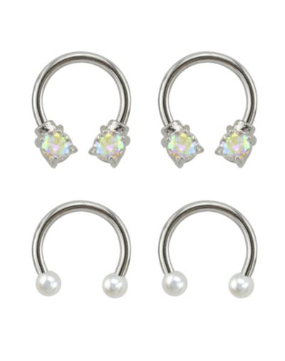 Includes: 2 Pair of horseshoe rings Piercing type: Mulitple Material: 316L Surgical steel, acrylic Gauge: Gauge/1.3mm Length: 3/8"/10mm Stone type: Pearlized, cubic zirconia Threaded closure Jewelry care: Clean with antibacterial soap and warm water Piercing Care: Clean with H2Ocean Aftercare Spray (sold separately) or saline solution Imported Note: Do not use any harsh, alcohol-based chemicals as this may cause tarnishing Do not over-thread or apply excess pressure when adding/removing beads as breakage could occur Surgical steel may contain trace amounts of nickel.