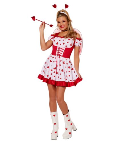 Everyone will be love-struck when you show up to your Halloween celebration in this Cupid Cutie Costume! This stunning outfit includes a white dress with red heart polka dots, a headband, a pair of wings, and of course a cupids arrow prop. Love is in the air! Includes: Dress Wings Headband Arrow Sleeveless Pullover style Material: Polyester Care: Spot clean Imported Note: Shoes sold separately.