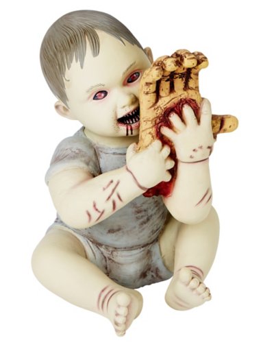 Little Steve loves his midnight snack! This terrifying zombie baby is always on the hunt for fresh meat, so you better stay far away when he gets hungry! Dimensions: 13.5" H x 10.5" W x 12" D Material: Latex Care: Spot clean Imported WARNING: Do not use if allergic to latex.