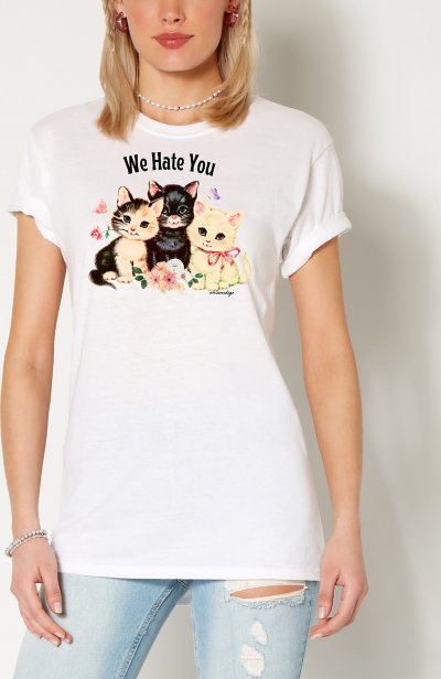 Show off your attitude with your casual outfit when you rock this We Hate You T Shirt. This stylish cat tee is a great way to add some personality to any casual look and is sure to get some laughs from your friends. Crewneck Short sleeves Material: Cotton Care: Machine wash; tumble dry low Imported This shirt is Unisex Sizing only For a fitted look, order one size smaller than your normal size Note: This item is print to order and may have a 1-2 day extra processing time.