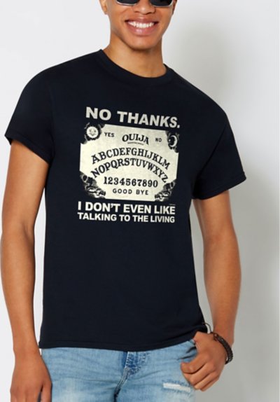 What's so good about talking to the living, anyway? Spruce up your gothic wardrobe with our officially licensed No Thanks Ouija T Shirt! Suit up in this stylish tee and you'll always be showing your spooky side. Officially licensed Crew neck Short sleeves Material: Cotton Care: Machine wash; tumble dry low Imported This tee is Unisex Sizing only For a fitted look, order one size smaller than your regular size.
