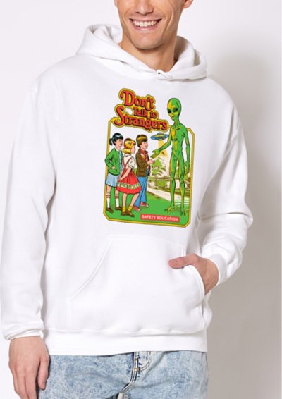 Friendly reminder: Don't talk to strangers. This officially licensed alien hoodie by Steven Rhodes is the perfect addition to your wardrobe and will have everyone giggling! Officially licensed Crewneck Long sleeves Material: Cotton Care: Machine wash; tumble dry low Imported This shirt is Unisex Sizing only For a fitted look, order one size smaller than your normal size Note: This item is print to order and may have a 1 to 2 day extra processing time Note: This style is also available as at shirt.
