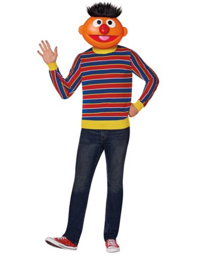 Celebrate your favorite Sesame Street character and look good doing it when you rock this officially licensed Ernie costume kit! Featuring a theatrical half mask and a striped shirt, this simple set is easy-to-wear and perfect for any fan. Officially licensed Includes: Half mask Sweater Turtleneck Long sleeves Pullover style Material: Polyester Care: Spot clean Imported Note: Pants and shoes sold separately.