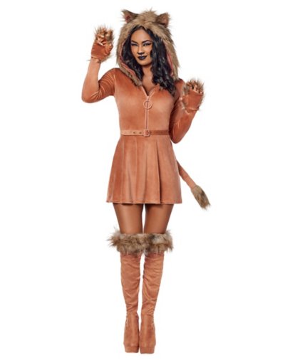 MEOW! Youll be feline good this Halloween when you dress up in this cute lioness costume! This bold lioness dress costume feels like silk and features a faux fur hood, fingerless gloves, and tail. Youll be ready to pack up and join the Halloween circus in this getup! Officially licensed Includes: Dress Belted tail Faux fur fingerless gloves Material: Polyester, spandex Long sleeves Care: Spot clean Imported Note: Shoes sold separately.