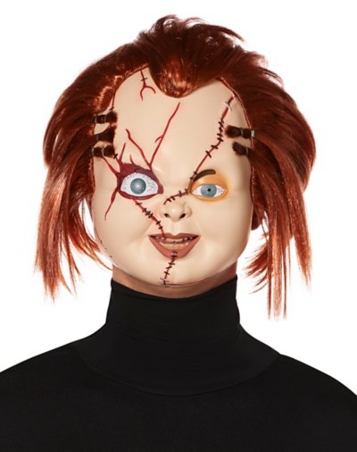 You'll be a walking Chucky doll in this full mask! This kids' Chucky mask features fiery red hair and bone-chilling facial scars. An elastic band keeps this scary mask secure while you're up to no good. Officially licensed Dimensions: Width: about 10 Height: About 10 Depth: About 5 Elastic closure Material: Plastic, synthetic fibers Care: Spot clean Imported.