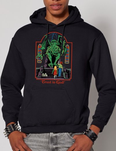 Trust in God, especially the one with enormous claws and green tentacles. This comfortable black hoodie features an official Steven Rhodes design that's guaranteed to earn a few laughs. Officially licensed Exclusively at Spencer's Crewneck Long sleeves Material: Cotton Care: Machine wash; tumble dry low Imported This shirt is Unisex Sizing only For a fitted look, order one size smaller than your normal size Note: This item is print to order and may have a 1 to 2 day extra processing time.