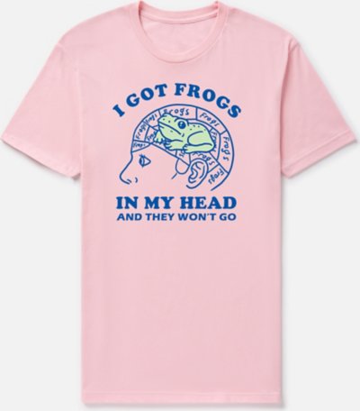 Let everyone know that you've got amphibians on the brain when you sport this officially licensed Frogs in My Head T Shirt! Suit up in this stylish Popcorn Punk tee and you'll be turning heads wherever you go. Officially licensed Crew neck Short sleeves Material: Cotton Care: Machine wash; tumble dry low Imported This tee is Unisex Sizing only For a fitted look, order one size smaller than your regular size This item is print to order and may take 1 to 2 days extra processing time.