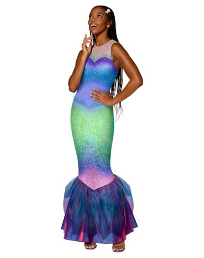 You'll look like the girl who has everything in this officially licensed The Little Mermaid adult Ariel costume! This enchanting costume includes an ankle-length mermaid-style dress with a sheer yoke and ruffled sweetheart neckline. Scales in brilliant purple, blue, green, and pink hues make this dress feel beautiful enough for a real-life mermaid. A multi-layer organza "fin" hem and a seashell hair accessory complete this dreamy Disney costume! Officially licensed Includes: Dress Hair accessory Sleeveless Zipper closure Material: Polyester, metal alloy Care: Spot clean Imported Note: Shoes sold separately.