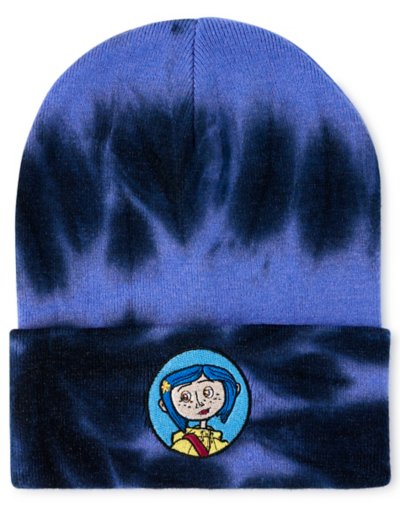 Be careful what you wish for... Show some love for everyone's favorite blue-haired cutie with this exclusive and officially licensedTie Dye Coraline Cuff Beanie. This indigo and black tie-dye beanie features an adorable embroidered Coraline logo! Exclusively at Spencer's Officially licensed Dimensions: 9.5" H x 8.3" W Regular fit Mid crown Material: Rayon, polyester, nylon Care: Hand wash cold Imported.