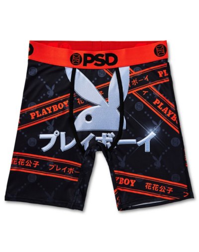Show off two of your favorite brands when wearing these PSD x Playboy boxer briefs. These boxers include an image of the iconic Playboy bunny head and their logo in Japanese. Officially Licensed Tagless Inseam length: 7" Breathable sealed MicroMesh pouch Four-way stretch Flatlock seams for extra durability Branded microfiber blend band Material: Polyester, spandex Care: Machine wash Imported.