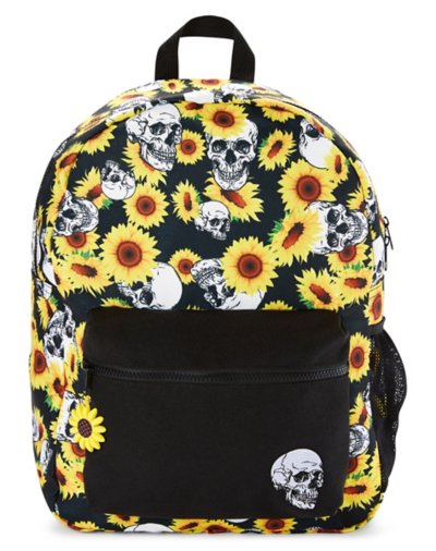 Buy Black Sunflower and Skull Backpack for $15.00 at @ Spencersonline.com