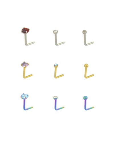 Includes: 9 Nose L-Bends Piercing Type: Nostril Material: 316L surgical steel Gauge: gauge/0.8mm Length: 8mm Stone Type: Cubic zirconia Jewelry Care: Clean with antibacterial soap and warm water Piercing Care: Clean withH2Ocean Aftercare Spray(sold separately) or saline solution Imported Note: Do not use any harsh, alcohol-based chemicals as this may cause tarnishing Surgical steel may contain trace amounts of nickel Wear in healed piercings only. If irritation occurs, remove immediately This is a decorative item and should not be worn to sleep.