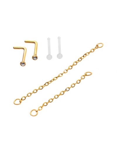 Includes: 2 Nose L-Bends 2 Nose bones 2 Nose chains Piercing Type: Nostril Material: 316L surgical steel Plating: Gold-plated Gauge: 18 gauge/1.0mm Stone Type: Cubic zirconia Chain Length: 1", 1.5" Jewelry Care: Clean with antibacterial soap and warm water Piercing Care: Clean with H2Ocean Aftercare Spray (sold separately) or saline solution Imported Note: Do not use any harsh, alcohol-based chemicals as this may cause tarnishing Wear in healed piercings only. If irritation occurs, remove immediately This is a decorative item and should not be worn to sleep S.