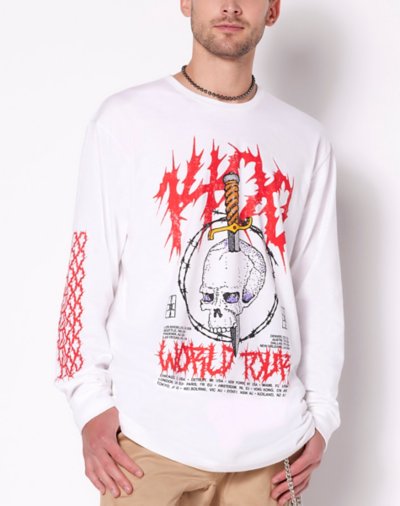 Show off your fandom with this exciting vintage world tour long sleeve 1400 Trippie Redd t shirt! This white long sleeve tee features a skeleton head with the top of a blade sticking out of it and "1400 World Tour" in red spiky writing. It's a surefire way to turn heads and let everyone know you love Trippie Redd. Officially licensed Exclusively at Spencer's Crewneck Long sleeves Tagless Length: About 28" from shoulder to hem Material: Cotton Care: Machine wash; tumble dry low Imported Regular fit For a fitted look, order one size smaller than your normal size.