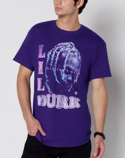 Show off your Lil Durk fandom whenever you wear this stylish purple tee. This officially licensed Lil Durk T Shirt shows him in profile with "Only The Family" written across him. Rep your favorite rapper and label in one bold look. Officially licensed Exclusively at Spencer's Crewneck Short sleeves Tagless Length: About 28" from shoulder to hem Material: Cotton Care: Machine wash; tumble dry low Imported Regular fit For a fitted look, order one size smaller than your normal size.