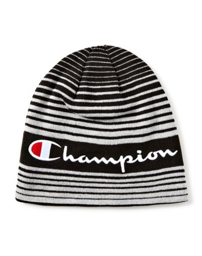 Complete your winter look with this Champion beanie hat! The reversible design makes it like youre getting TWO hats, one plain black and one black with white stripes! Officially licensed Regular fit Mid crown Material: Acrylic Care: Hand wash Imported.