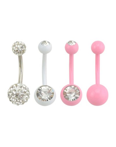Includes: 4 Belly rings Piercing Type: Belly Barbell Material: 316L surgical steel Accent Material: Metal alloy Gauge: Gauge Length: 3/8" Ball Size: 5mm/8mm Threading Type: Internal Jewelry Care: Clean with antibacterial soap and warm water Piercing Care: Clean with H2Ocean Aftercare Spray (sold separately) or saline solution Imported Note: Do not use any harsh, alcohol based chemicals as this may cause tarnishing Surgical steel may contain trace amounts of nickel.