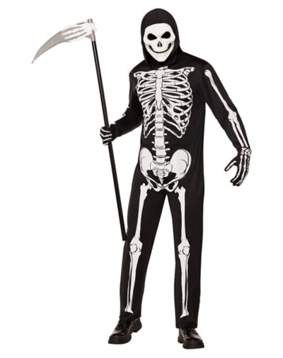 He's all skull and bones! Creep them out in this bone-chilling Adult Skeleton Jumpsuit that makes it look like you really are a skeleton. The black jumpsuit is accented with skeletal graphics and comes complete with a mask, a hood, and gloves. Includes: Hooded jumpsuit Gloves Half-mask Long sleeves Button closure Inseam: About 33.5" Material: Polyester Care: Hand wash Imported Note: Cane, top hat, and shirt sold separately.