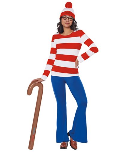Where's Waldo? With his best friend Wenda! Dress up like Wenda the amazing wanderer in this officially licensed costume kit. This Wenda costume kit includes a red and white shirt with long sleeves, a beanie hat, a pair of glasses, and an inflatable cane. Officially licensed Includes: Shirt Hat Glasses Inflatable cane Long sleeves Material: Cotton, polyester, acrylic, PVC Care: Hand wash Imported Note: Pants and shoes sold separately.