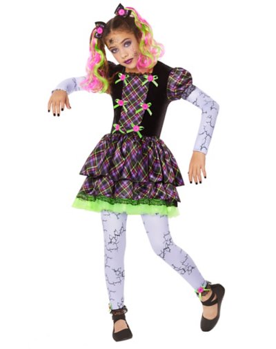 This Kids Neon Broken Doll Costume is a spooky sweet delight! Bring this shattered doll to life in neon hues that will light up the night. Bows, buttons, and playful plaids make this broken doll anything but dull. Cracked detailing adorns the sleeves and leggings for an eye-catching broken porcelain effect. Complete the look with neon hair extensions! Includes: Dress Footless tights 2 Hair bows 2 Hair clip extensions Long sleeves Pullover style Material: Polyester, spandex Care: Spot clean Imported.