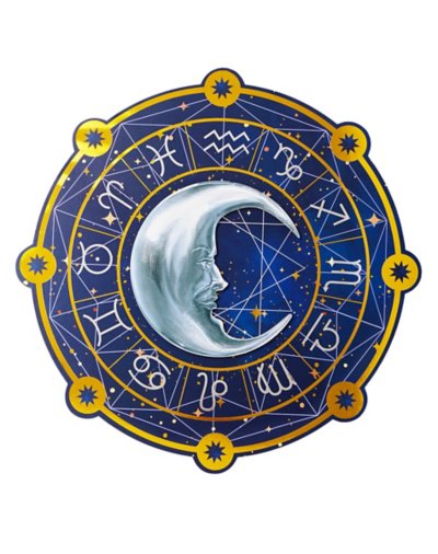 Add some new age chic to your home decorating with this Tarot Astrology Sign! This blue and goldtone sign features a moon with a face in the middle and the symbols of the zodiac signs around it. It will look wonderful hanging in any room of your home. Dimensions: 14"H x 14"W x 0.5"D Material: Medium density fiberboard Care: Spot clean Imported.