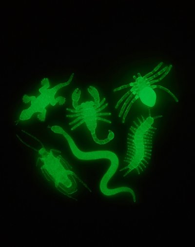 Give your home the perfect spooky touch when you leave these glow critters around the house in strategic locations! These assortedanimals are the perfect way to give your guests a fright. Hold under direct incandescent or LED light for 1-5 minutes to activate glow Includes: 24 glow critters Material: PVC Imported.